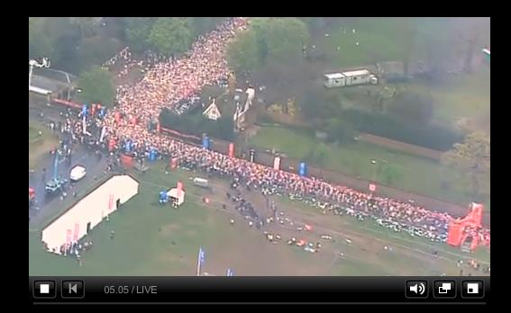 自分はランナーにマッサージ。ゴールゾーンすぐそばの建物に待機してました。スタートはテレビ中継で観戦。スタート後30分以上たっても未だスタートできていないヒトで溢れかえってます…。